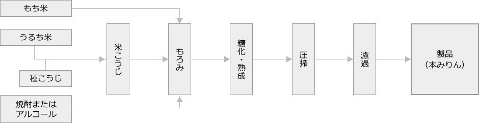 本みりんは、一般的には米(もち米、うるち米)、米こうじ(うるち米)に焼酎又はアルコール、(その他政令に定める物品)を原料として仕込み、40日~60日間に掛けて糖化・熟成させて濾したものです。